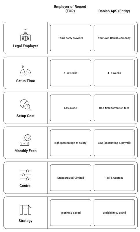 - Choose ApS if: You are hiring 2+ people, hiring senior leadership, or viewing Denmark as a long-term strategic hub.